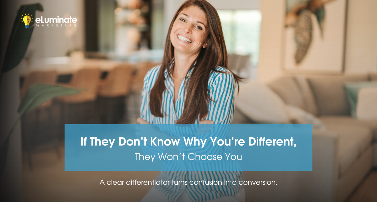If you want us to create a clear differentiator for you simply email Lyndsi@eluminatemarketing.com. Tell us about who you serve, the problem you solve, the result you deliver, and your approach. We’ll send back a clear, personalized differentiator you can use on your website, email signature, and intro call.